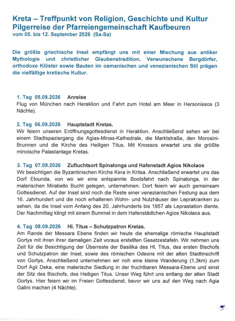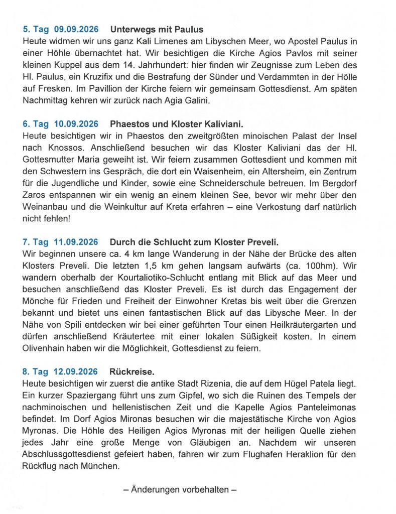 Die größte griechische Insel bietet einen Schatz an antiker Mythologie und christlicher Glaubenstradition. Wir werden auf Kreta den Reichtum der Insel entdecken und auch den Spuren des hl. Titus und des hl. Paulus folgen.