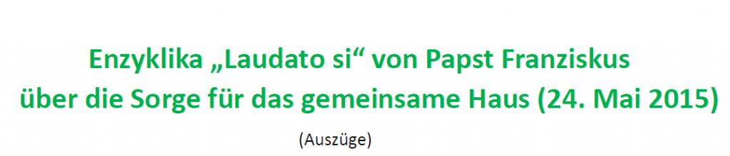 Papst Franziskus hat zum Thema unserer Veranstaltungsreihe eine Enzyklika geschrieben. Wir haben für Sie Auszüge aus seiner Enzyklika „Laudato si“ zusammengestellt: